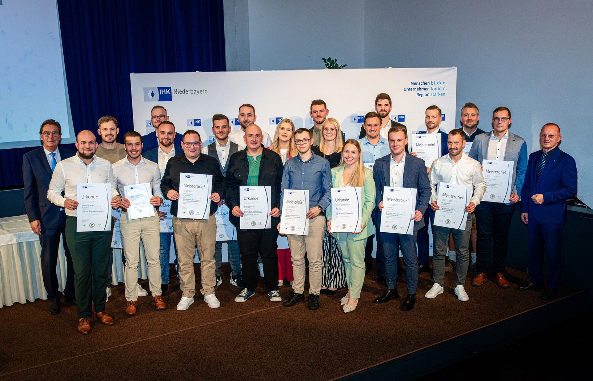Sie haben das notwendige Wissen und Können aufgebaut, um die wirtschaftlichen Herausforderungen der Zukunft anzugehen und den tiefgreifenden Wandel zu gestalten: Über 400 Absolventen einer beruflichen Weiterbildung – darunter 42 aus dem Landkreis Deggendorf – haben diese Woche bei einer Feier in Dingolfing ihre Zeugnisse und Meisterbriefe erhalten. Sie alle hatten sich zuvor erfolgreich der IHK-Prüfung gestellt und damit Abschlüsse auf Bachelor- oder Masterniveau erlangt. Zu diesem Erfolg und dem wichtigen Karriereschritt gratulierten gleich zwei Vizepräsidenten der IHK Niederbayern: Franz-Xaver Birnbeck und Hans Graf.