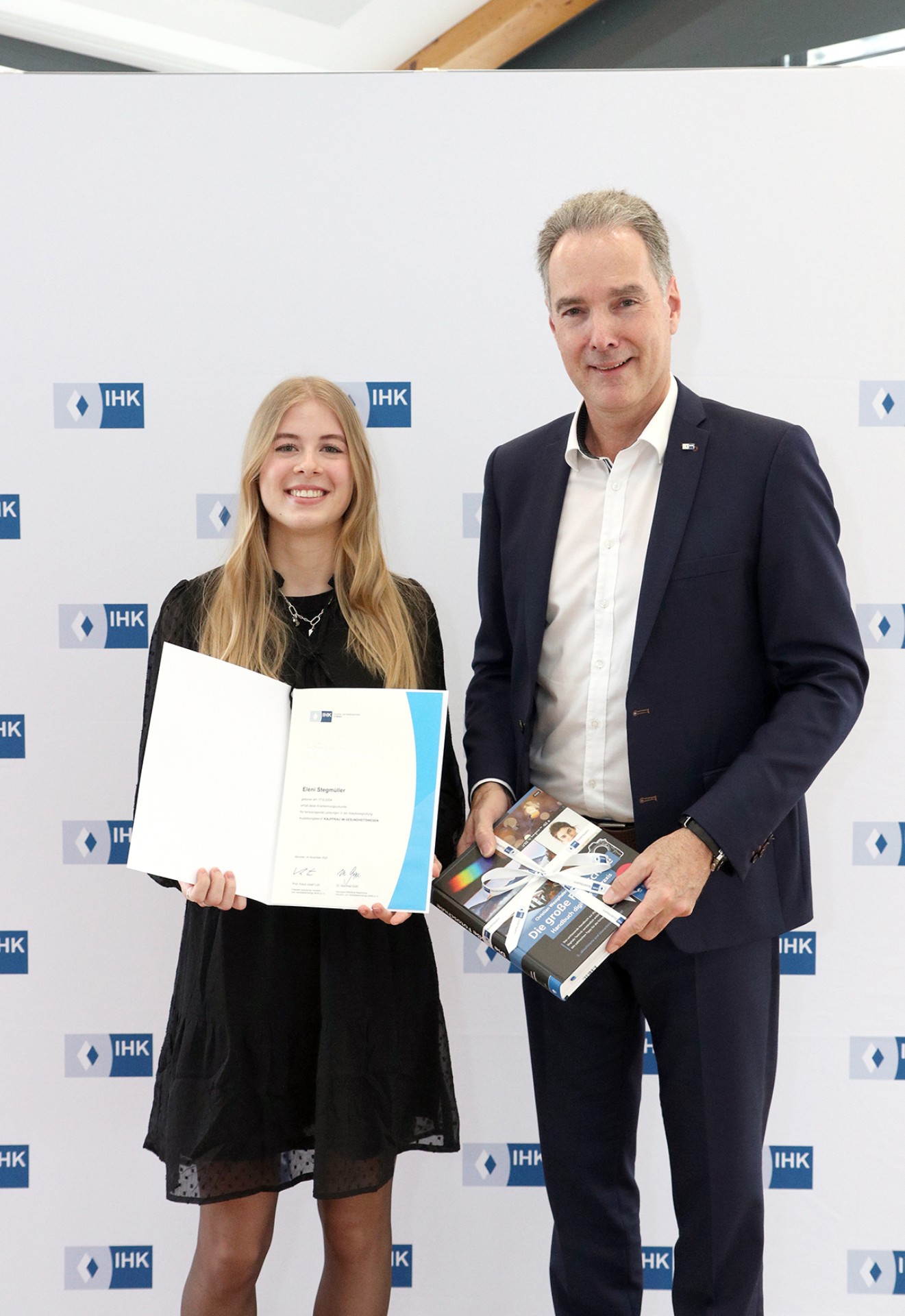 © IHK Niederbayern Die Landesbeste aus Rottal-Inn, Eleni Stegmüller, zusammen mit IHK-Hauptgeschäftsführer Alexander Schreiner.