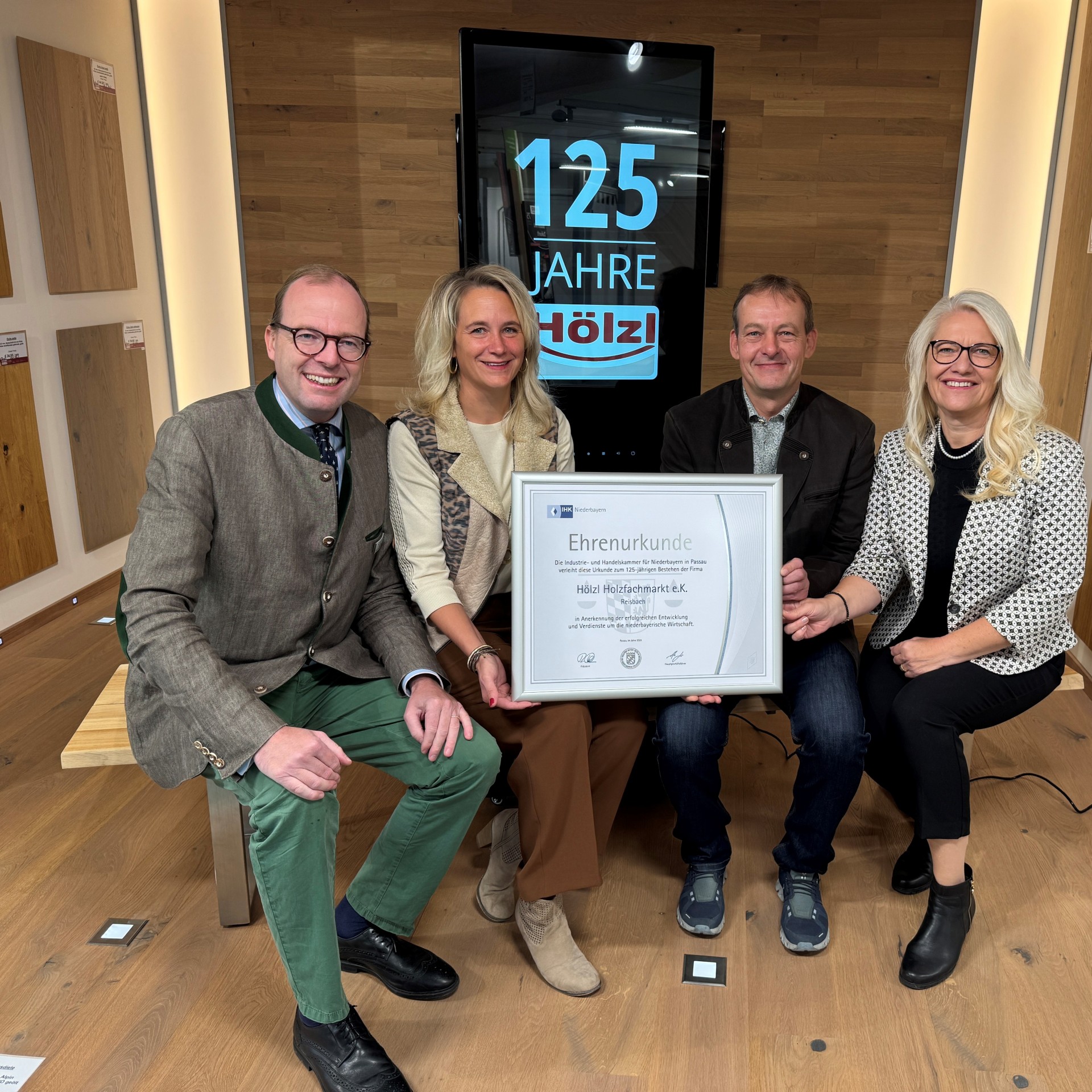 Ein außergewöhnliches Jubiläum kann in diesem Jahr der Holz-Fachmarkt Hölzl in Reisbach feiern: Seit 125 Jahren steht der Familienbetrieb für Qualität, Verlässlichkeit und persönliche Beratung rund ums Thema Holz. Anlässlich dieses Jubiläums überreichte IHK-Vizepräsident Max-Georg Graf von Arco auf Valley dem Unternehmen eine Ehrenurkunde der IHK Niederbayern. „Betriebe wie Ihrer sind das Rückgrat unserer niederbayerischen Wirtschaft. Sie verbinden handwerkliche Kompetenz mit regionaler Verantwortung und sichern Arbeitsplätze – seit Generationen“, betonte Graf von Arco bei der Übergabe.