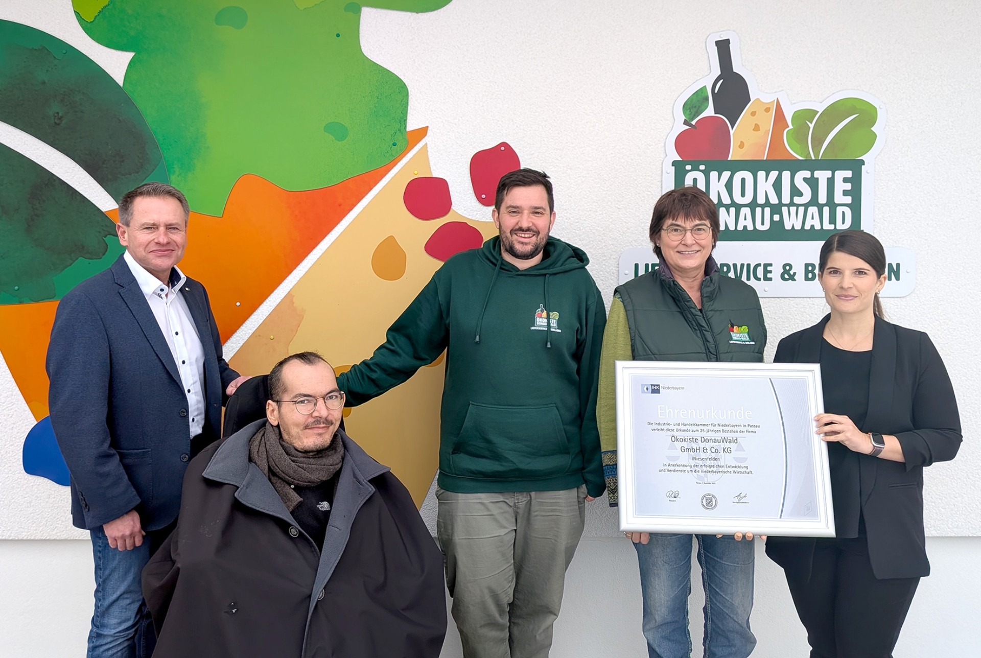 Seit über 25 Jahren steht die Ökokiste DonauWald für regionales und nachhaltiges Wirtschaften sowie ein starkes Miteinander. Woche für Woche liefert das Unternehmen frische Obst- und Gemüsekisten an Kunden in Niederbayern und der Oberpfalz. Das Unternehmen gehört zu den Bio-Pionieren in der niederbayerischen Wirtschaft und hat sich seit der Gründung stetig weiterentwickelt. Zu dieser erfolgreichen Unternehmensgeschichte hat nun die Vizepräsidentin der IHK Niederbayern Katharina Venus der Geschäftsführung mit einer IHK-Ehrenurkunde gratuliert.